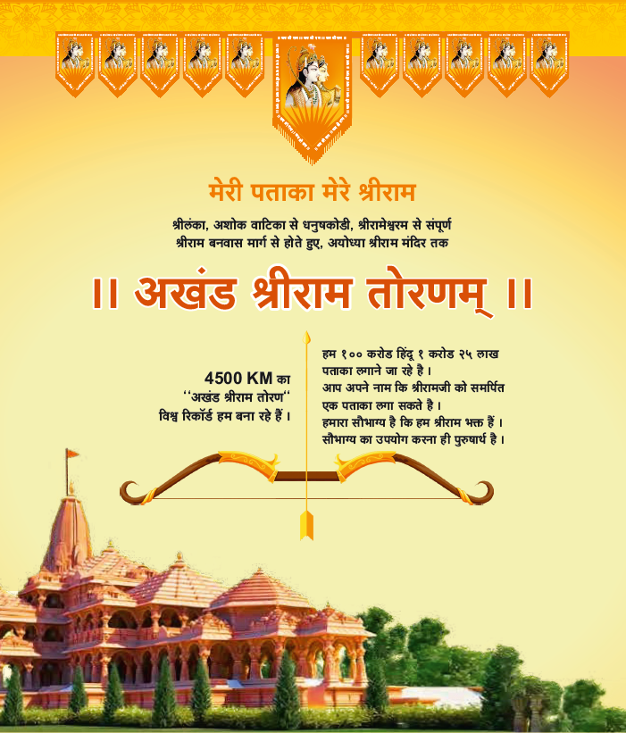 अखंड श्रीराम तोरणम् समारोह में आपको अपने नाम की एक पातका (पताका) श्रीराम पथ पर लगाने का अद्वितीय अवसर प्राप्त हो सकता है। इस पातका को आपको वापस भी सौंपा जाएगा, जो आपके घर में आशीर्वाद और पुण्य का स्रोत बनेगी।